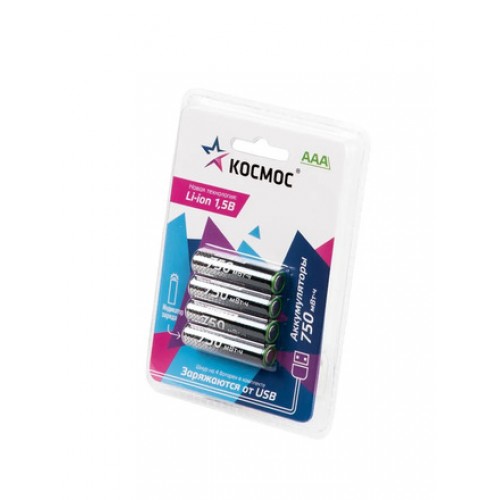 Аккумулятор литиевый Космос R03 ААА Li-ion 750 mWh 4 шт на блистере 4BL зарядка от USB