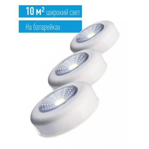 Источник света: 1 Вт COB LED; Источник питания: 3xAAA (в комплект не входят); Количество режимов: 1 (яркий); Световой поток: 80 лм.; Дистанция освещения: 10 м2; Корпус: ABS-пластик, IP42; Размер: 7.0x7.0x2.5 см.; Самоклеящаяся поверхность; 3 штуки в комплекте.